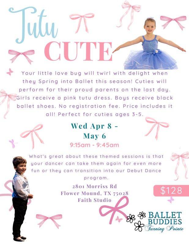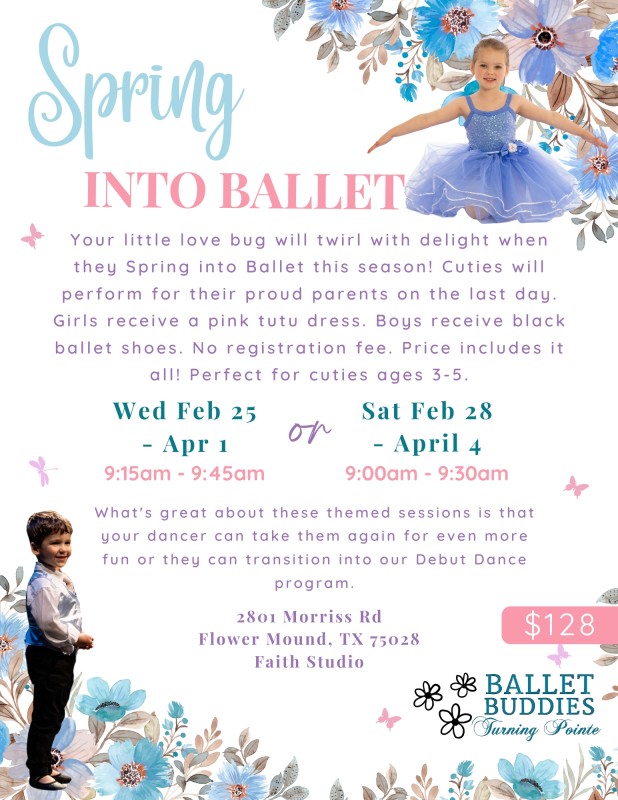 No registration fee. $128 includes it all! Perfect for littles ages 3-5. Offered in themed 5 week sessions so dancers can continue leaping and learning each session.