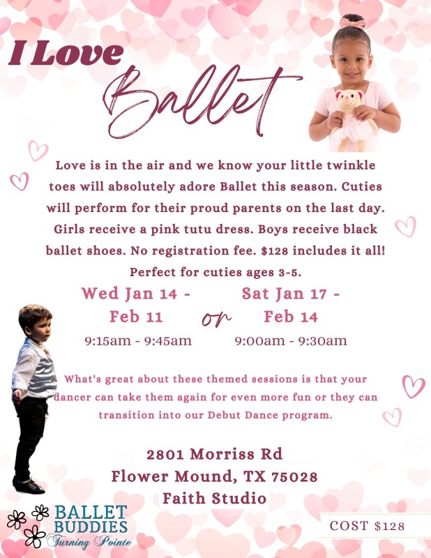 Great question! Our Ballet Buddies program is an introductory Ballet class that meets in five week sessions with an in-studio performance at the end. Each session is themed and kiddos can take them all.